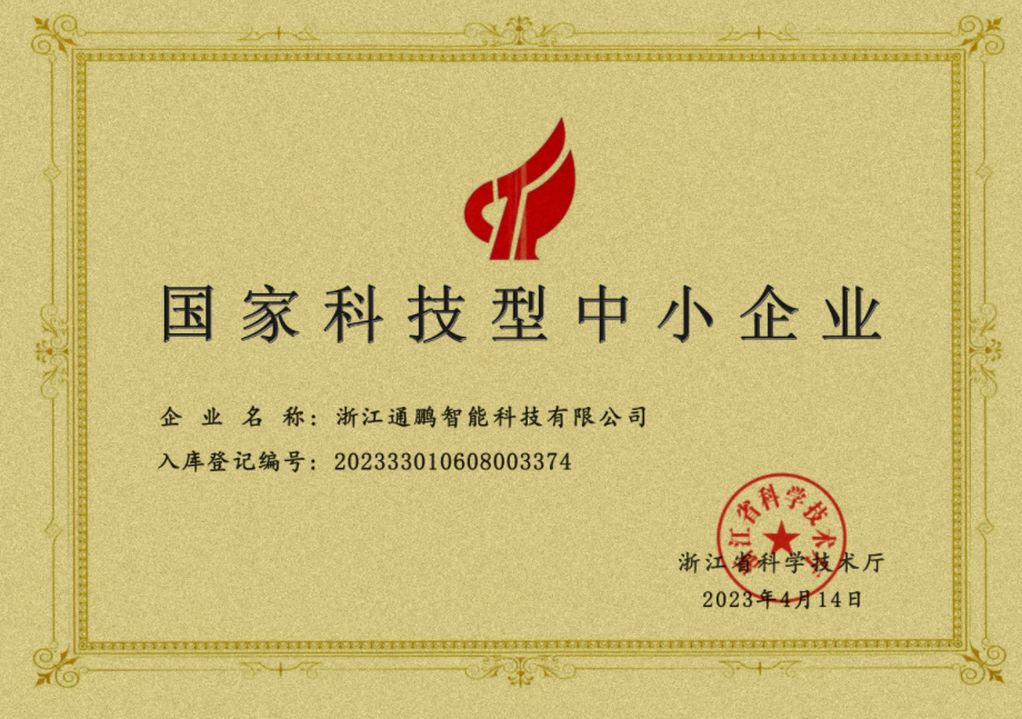 2023年04月 公司被浙江省科学技术厅认定为“国家科技型中小企业”