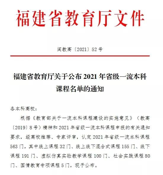 2021年12月31日,福建省教育厅公布《福建省教育厅关于公布2021年省级一流本科 课程名单的通知》(闽教高〔2021〕52号)。