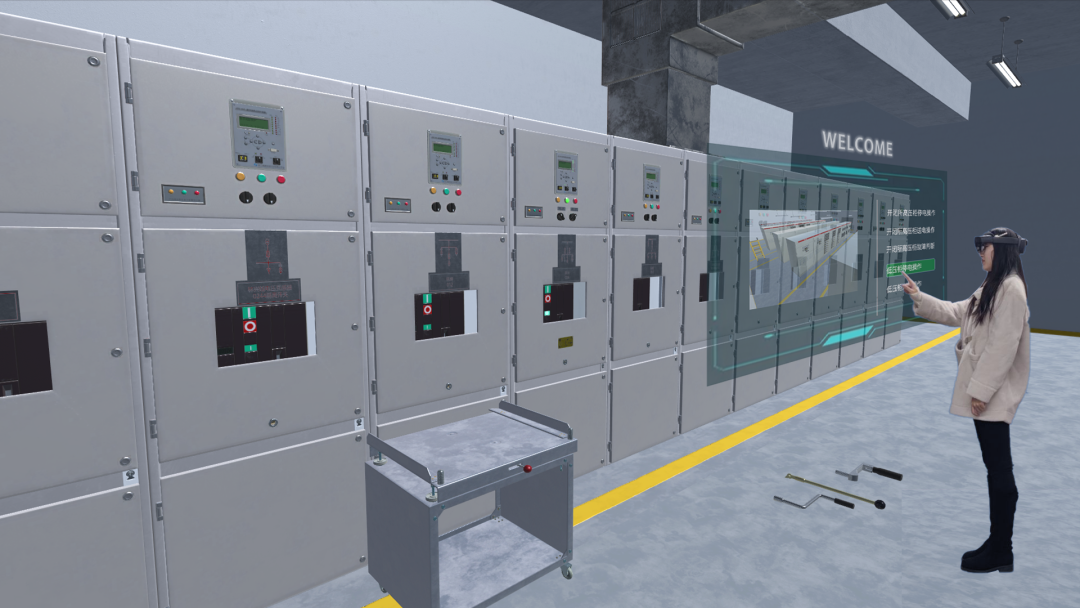 采用MR混合现实技术、三维建模技术、多媒体技术等技术设计建立一个基于现实空间及环境的虚拟场景或虚拟设备;在现实空间中,通过手势操作可对虚拟场景或虚拟设备进行设备巡视检修、电气试验等。