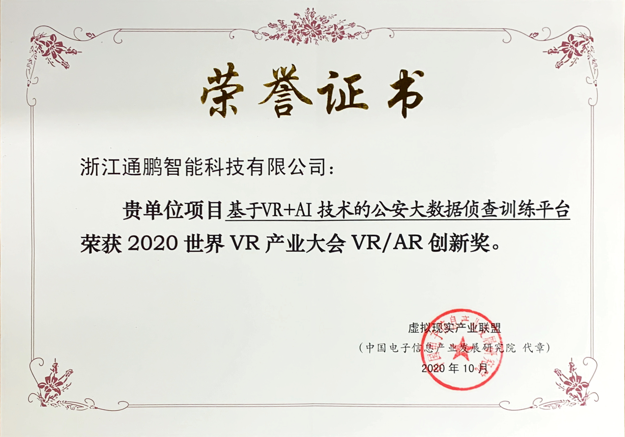 本次云峰会发布了VR/AR年度创新奖名单,其中由通鹏科技全新自主研发的“基于VR+AI公安大数据侦查训练平台”在共82个企业和单位的103个参评项目中脱颖而出,获得2020世界VR产业大会VR/AR年度创新奖。这也是通鹏科技第二次获评2020世界VR产业大会VR/AR年度创新奖。感谢组委会对通鹏科技研发成果的认可。